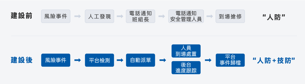 風險事件由人手發(fā)現(xiàn)到通過電話通知,再到現(xiàn)場進行搶修,處理問題的及時性難以保障,風險管控能力較弱,還處於傳統(tǒng)的「人防」模式。