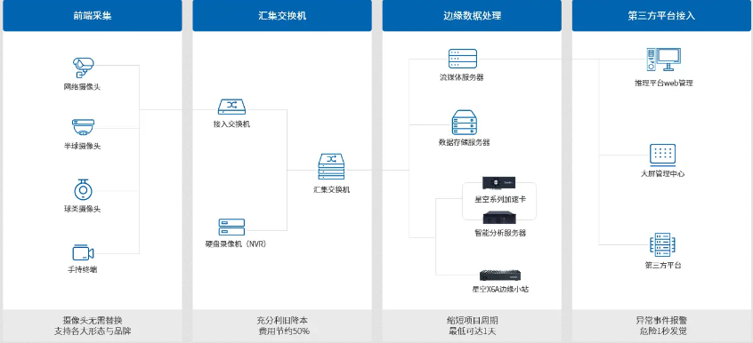充分利舊,將企業(yè)原有攝像頭連接AI視頻分析盒子,支持接入各大品牌各大廠商攝像頭,降低使用成本和替換成本,部署周期短,即插即用。
